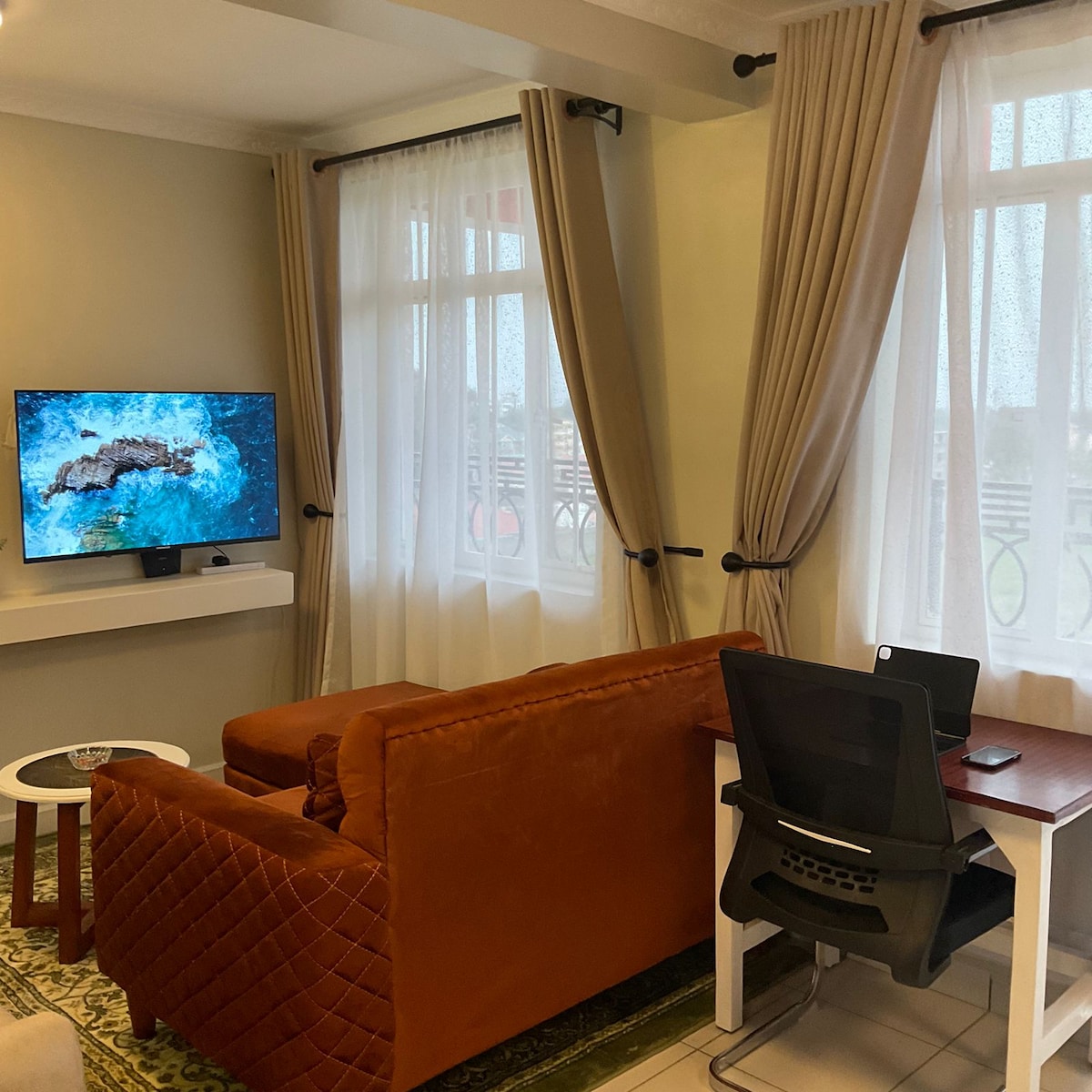 Experience urban elegance in a well-styled apartment 5km from Nakuru City CBD, and 7km from Nakuru National Park. The apartment features high-speed internet, a Smart TV, large super-elastic foam to ensure a comfortable sleep, a fully equipped kitchen with a microwave, fridge, and gas cooker, and a front-loading laundry machine that can handle 7kg loads. Enjoy an unmatched experience that leaves you feeling rejuvenated.