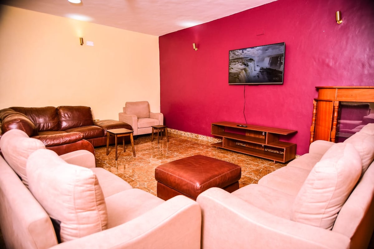 The house is a five-bedroom mansion with six bathrooms, surrounded by a beautifully manicured garden where guests can relax and unwind. The property is located within a gated compoundand offers 24/7 security for peace of mind. Guests have access to free on-site parking. This home is ideal for groups, professionals, families with children, singles, and couples. All bedrooms are fully ensuite and equipped with high-speed internet for comfort and convenience.