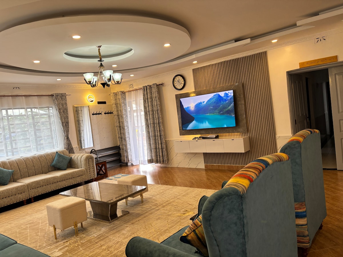 Have fun with the whole family at this stylish modern villa lcated in a safe location near Nakuru City Center. There is a power backup system. The villa has Four en-suite bedrooms with balconies, there is an extra room upstairs that can be used for entertainment/relaxing/ movie room - it has a large screen. For families with children, there is a baby cot bed. There is a 75 inch smart tv and WI-FI. Also there is Netflix.
