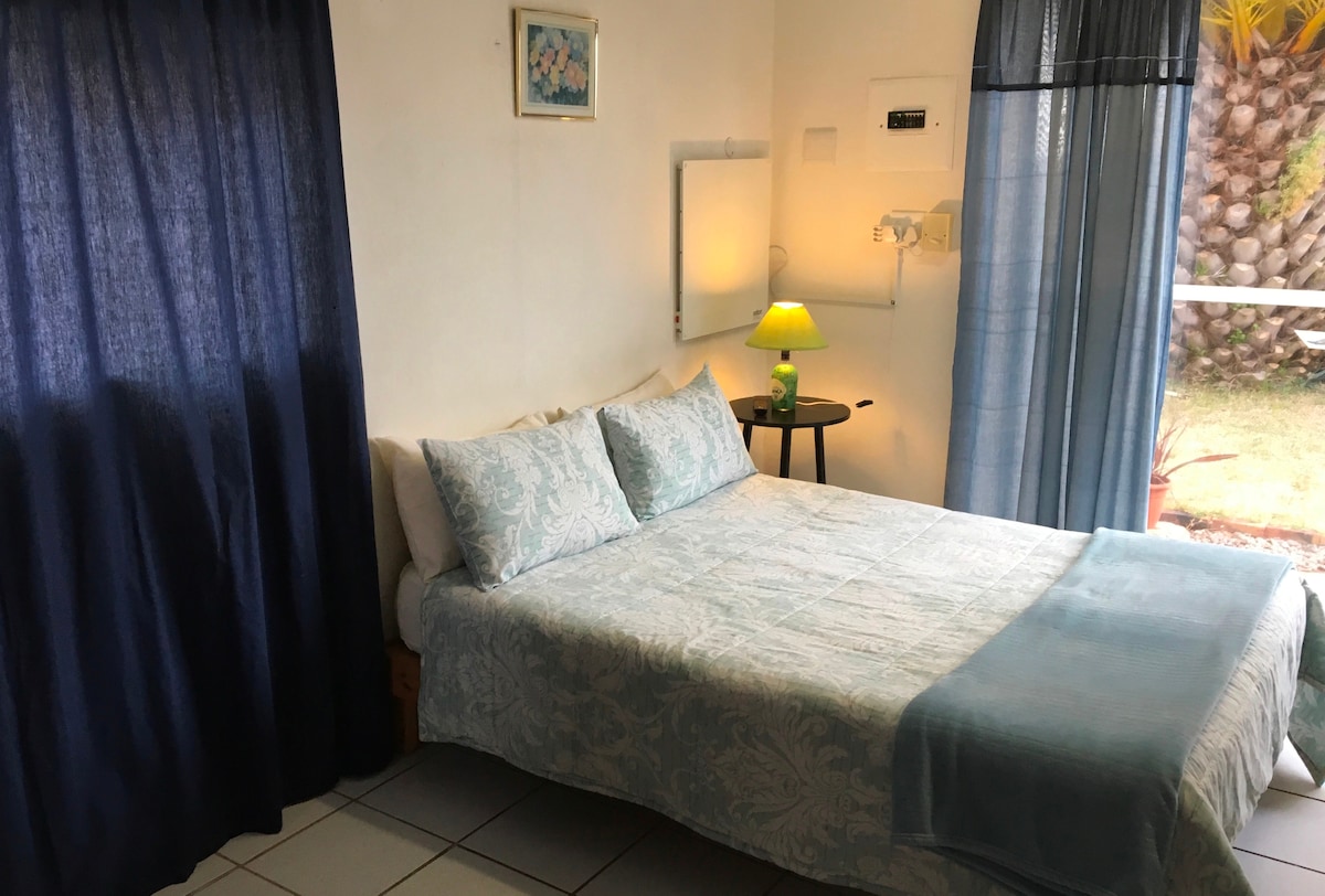 This first-floor studio apartment is ideal for an overnight stay. It features a queen-size bed and an en-suite bathroom that is fitted with a shower. Outside, there is a braai patio with portable braai facilities.