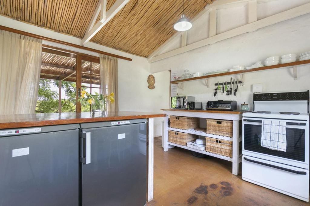 Thached roofed cottage behind the main house, totally private with own entrance. The cottage is fully equipped, self catering. AC in lounge and panel heater in the rooms.