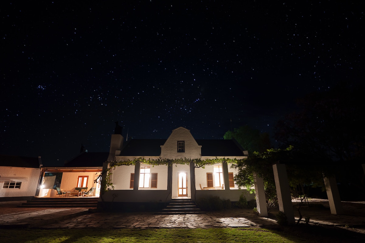 The Karoo Homestead is a 200-year-old gem with wood hauled 500 km by ox-wagon—a mystery to this day. The main house offers 2 bedrooms, 2 bathrooms, a big kitchen, bar, TV lounge and a patio with classic Karoo views. The chalet adds 2 more rooms. The garden feels like a mini adventure park with hidden swings. At night, the stars put on a show. It’s history, charm and Karoo magic in one unforgettable stay.