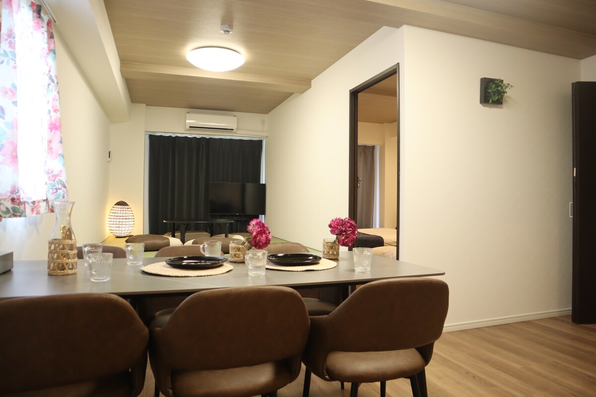 和の温もり溢れる広々空間で、心安らぐひとときを この民泊は、和の心地よさを感じる広々とした空間で、最大10名まで宿泊可能。日本の伝統的なデザインに現代的な快適さを融合させ、和の落ち着いた雰囲気を大切にしています。木の温もりが感じられる家具や、自然な色合いのインテリアが、心を落ち着ける空間を作り出しています。 リビングや寝室は、シンプルでありながらも心地よく、ゆったりとした時間をお過ごしいただけます。和の美しさを取り入れた空間に、心安らぐひとときを提供するためのベッド5台、ダイニングテーブル、ソファなど、必要なものがすべて整っています。日本の伝統的な美学を感じながら、贅沢にくつろげる空間です。 細部にわたる和のテイストが、忙しい日常から解放され、ほっと一息つけるような空間作りをしています。日本ならではの温かみを感じながら、現代的な便利さもしっかりと兼ね備えた、贅沢で快適な滞在をお楽しみください。