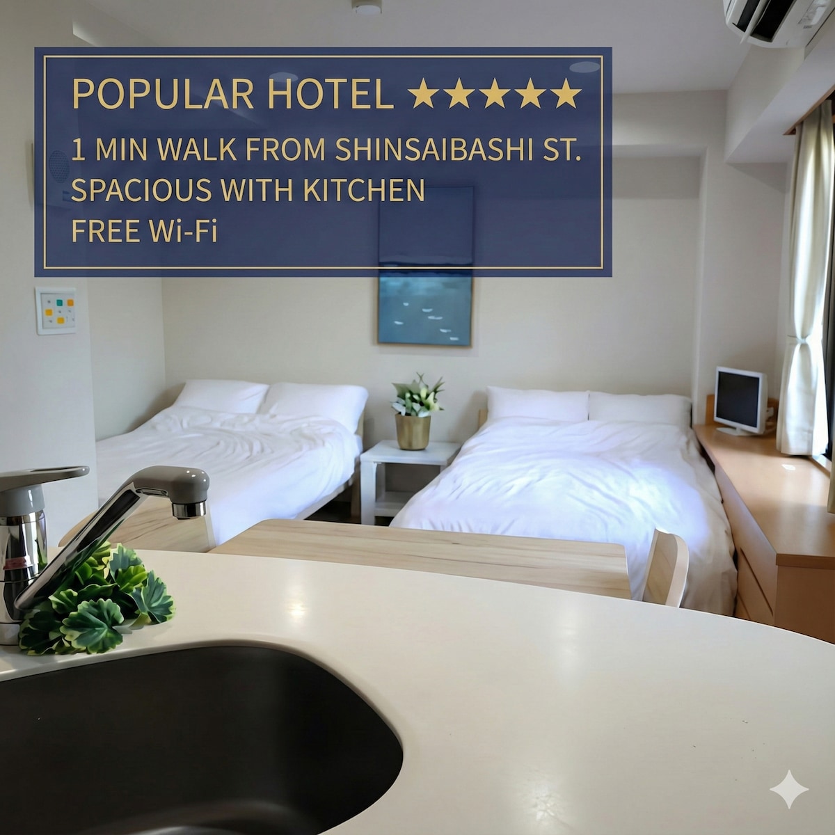 【靠近车站】从心斋桥站步行1分钟即可到达!步行5分钟即可抵达道顿堀!18平方米大型双床房,带厨房!可当天预订