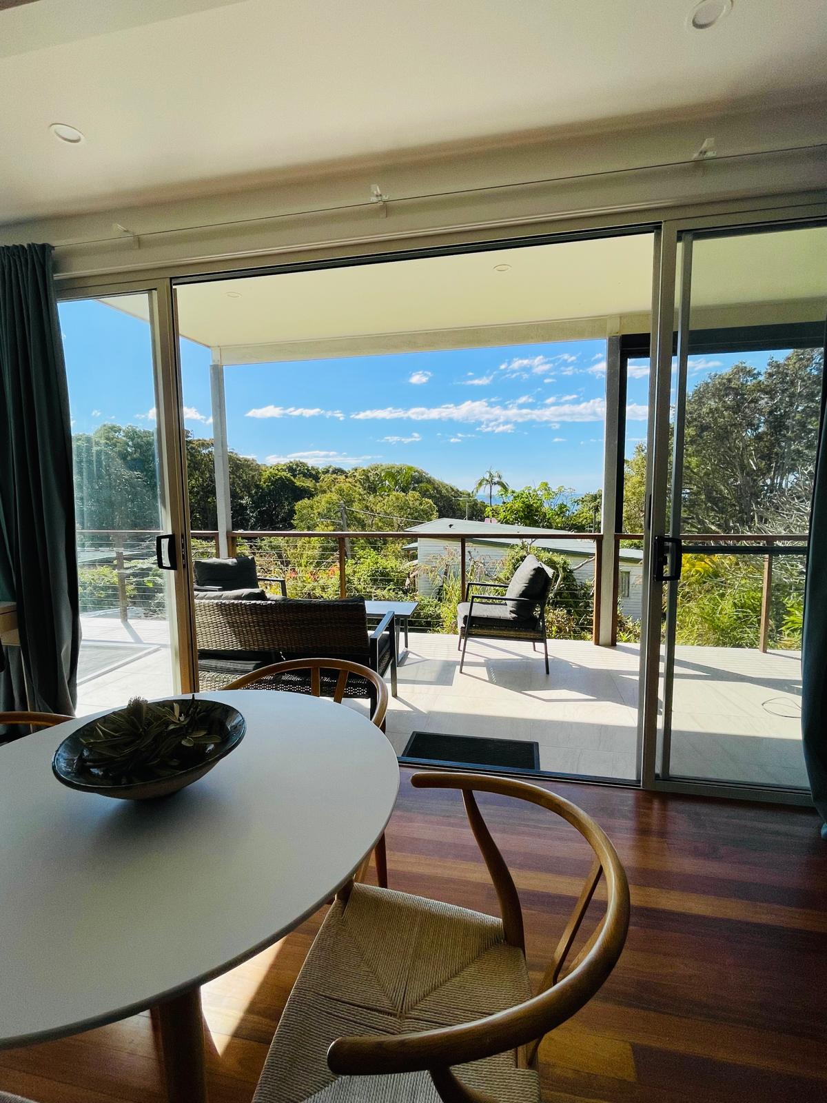 Comfortable and spacious open plan living, older style home with big family kitchen and stunning views of ocean and hinterland. Romantic King bedroom with ensuite, and private verandah perfect for couples. Also ideal for family getaways with separate children's area 2nd TV/DVD. All linen provided. Wireless internet & Netflix. Fenced garden, pet-friendly, 5-minute walk or a short drive down to beach. Tiled throughout. Pets welcome, Telescope for Whale watching. Full refund if need to cancel.