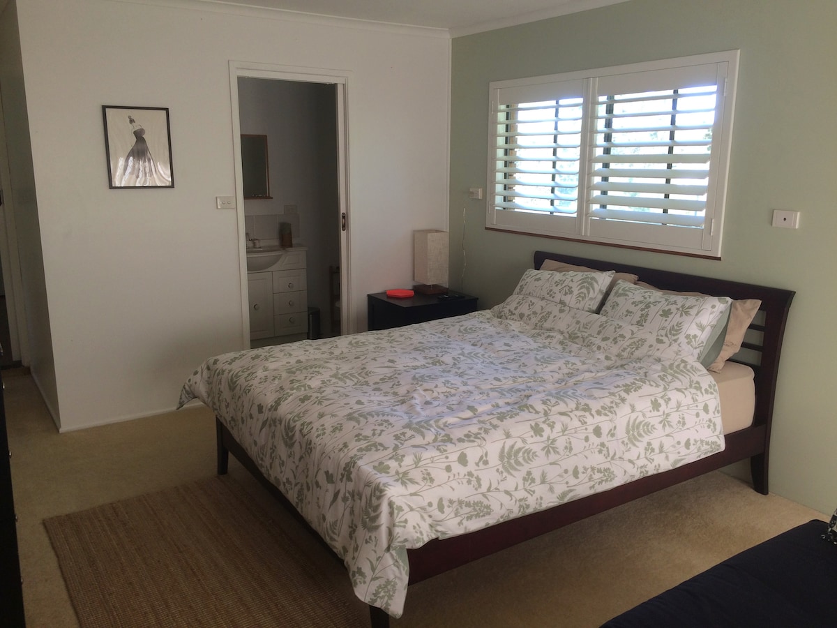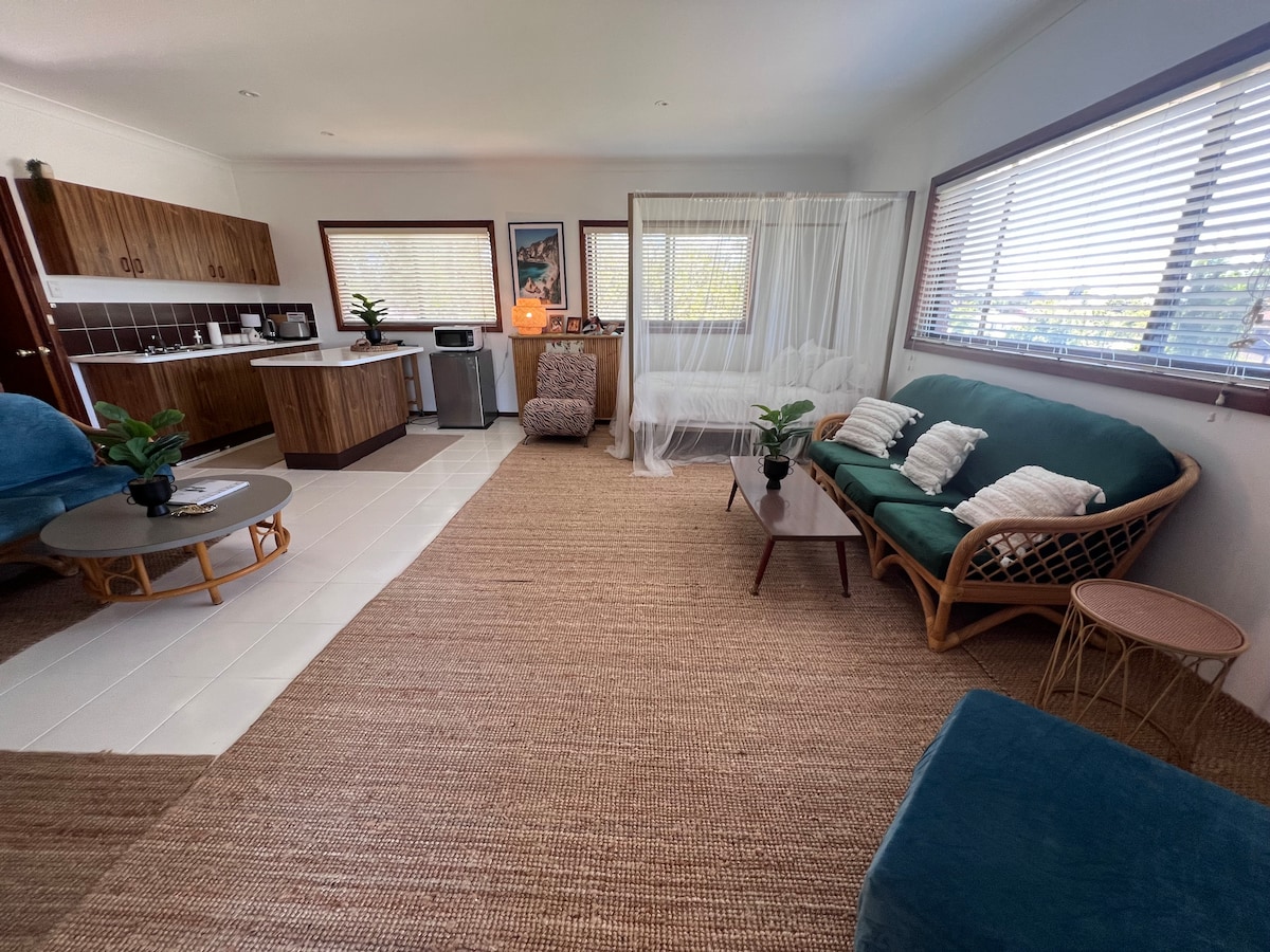 Spacious, airy, comfortable Open Plan Studio 5 mins to beach. Perfect for Couple, Small Fam. Peaceful, private, elevated. Wake to birdsong, sleep to waves. Mins to Big Beach, shops, cafes. Perfect beach break, get away, weeknd, work from home, long drive stop over. Queen bed, pullout single bed , sofa, kitchenette, bathroom. Private sunny rear deck & portico. A comfortable lovely space for 1 - 3 people. The perfect sweet little Beach Break.