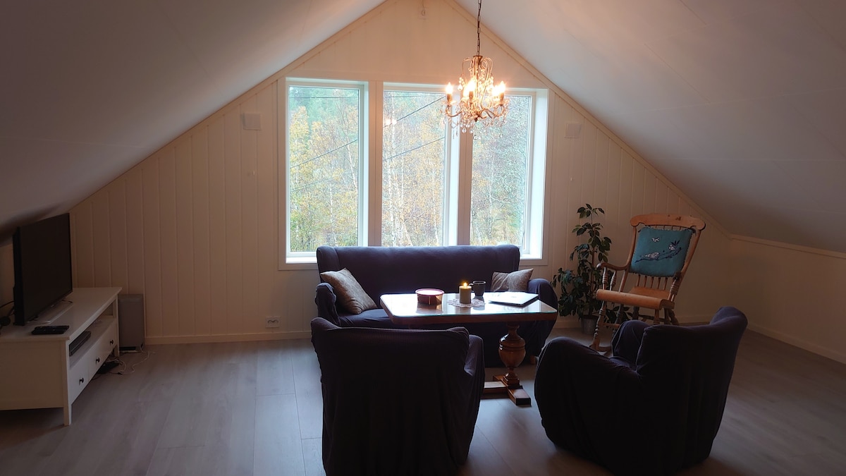 Lun og koselig liten leilighet i 2. etasje over garasjen vår. Naturskjønne og fredelige omgivelser med et rikt dyreliv. Fiskeelv i nærheten. Tilgang til gapahuk med bålpanne ved forespørsel. 10 min med bil inn til Namsos. Mulighet for El-billader. Ved forespørsel kan vi legge inn ekstra madrass/reiseseng på gulvet til et barn.