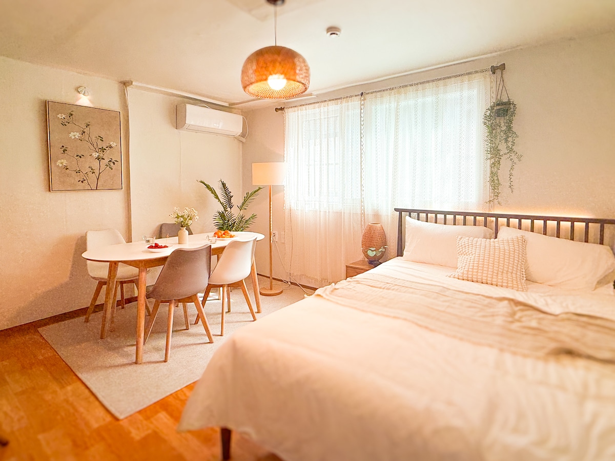 Experience the serene & cozy vibe of Under Cloud—a spacious 50m² home with two charming bedrooms, brick-finished living room, beautiful kitchen & bathroom, extra storage room, and a cozy balcony +hammock. In a quiet yet convenient area, offering easy access to Seoul’s best spots and the airport. Please click “Show more”. ☛ On foot Hongdae: 15min | Hapjeong Stn.(Line 2/6): 8min | 2 Malls: 5min ☛ By bus/subway Incheon Airport: 50min | Old Palaces: 30–40min | Myeong-dong: 30min | Gangnam: 40min