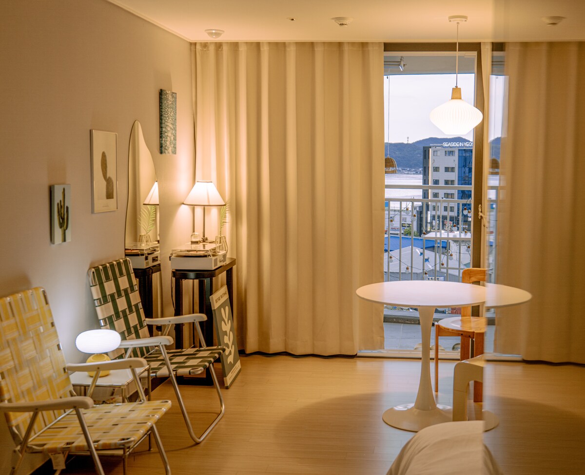 免费停车、距离李舜臣广场 7 分钟、咖啡馆式照明、海景、白木装修、高级住宿体验、清洁第一、休息区、