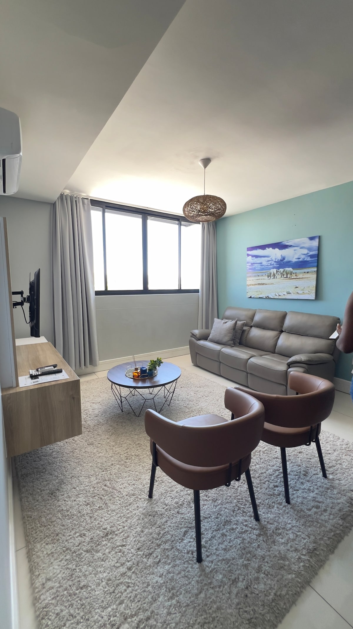 Modern top-floor apartment in downtown Swakopmund with a chic boho vibe! Enjoy a bright 1-bedroom, 1-bath retreat with a fully equipped functional exercise room for workouts, yoga and meditation. Relax on the private patio with stunning sunset views or enjoy a romantic pizza night using the gas pizza oven provided. This space is perfect for work and play, featuring fast Wi-Fi, a dedicated workstation and a cozy living space with Netflix. Just steps from shops, cafes, and local attractions!