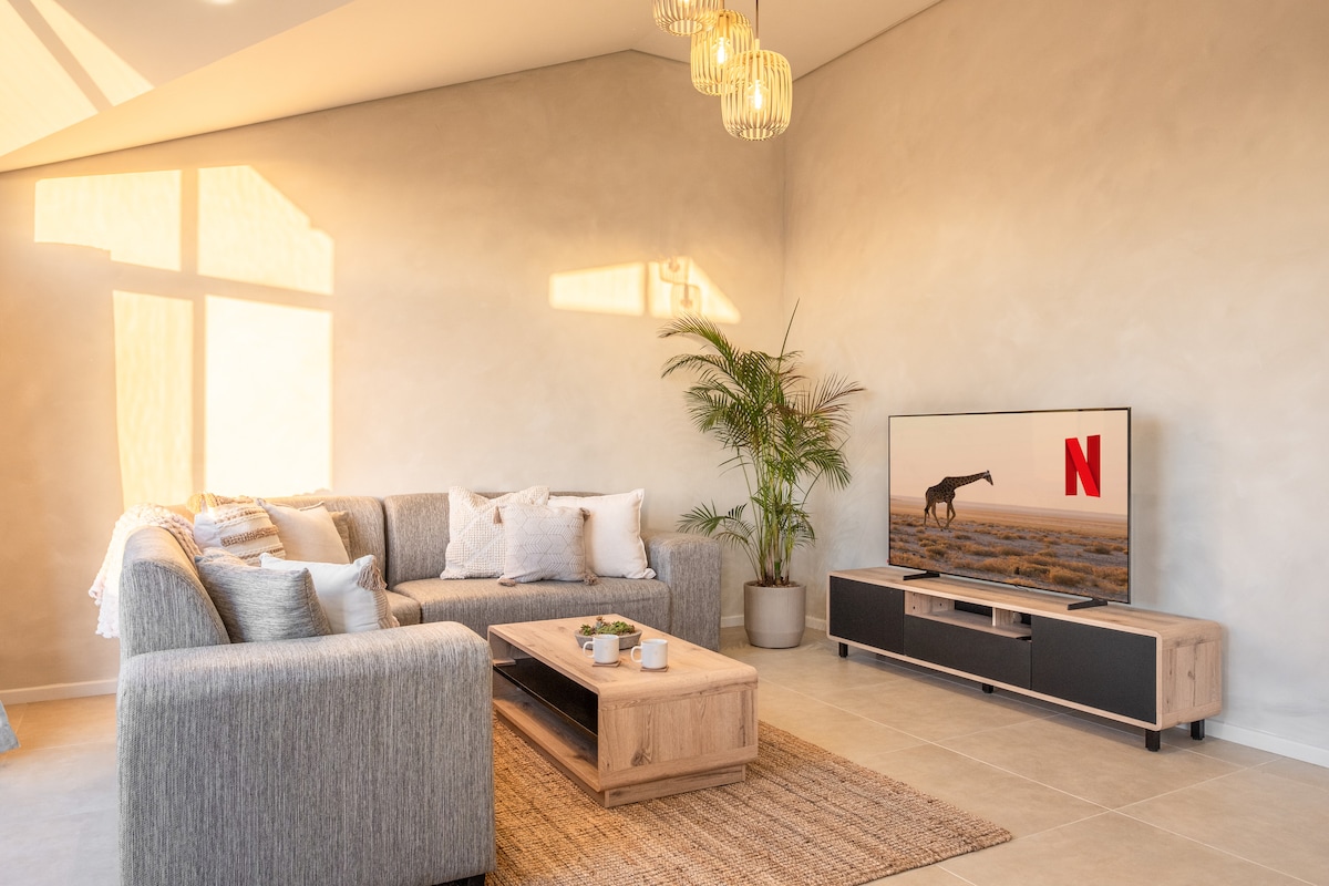Modern top-floor apartment in downtown Swakopmund with a chic boho vibe! Enjoy a bright 1-bedroom, 1-bath retreat with a fully equipped functional exercise room for workouts, yoga and meditation. Relax on the private patio with stunning sunset views or enjoy a romantic pizza night using the gas pizza oven provided. This space is perfect for work and play, featuring fast Wi-Fi, a dedicated workstation and a cozy living space with Netflix. Just steps from shops, cafes, and local attractions!