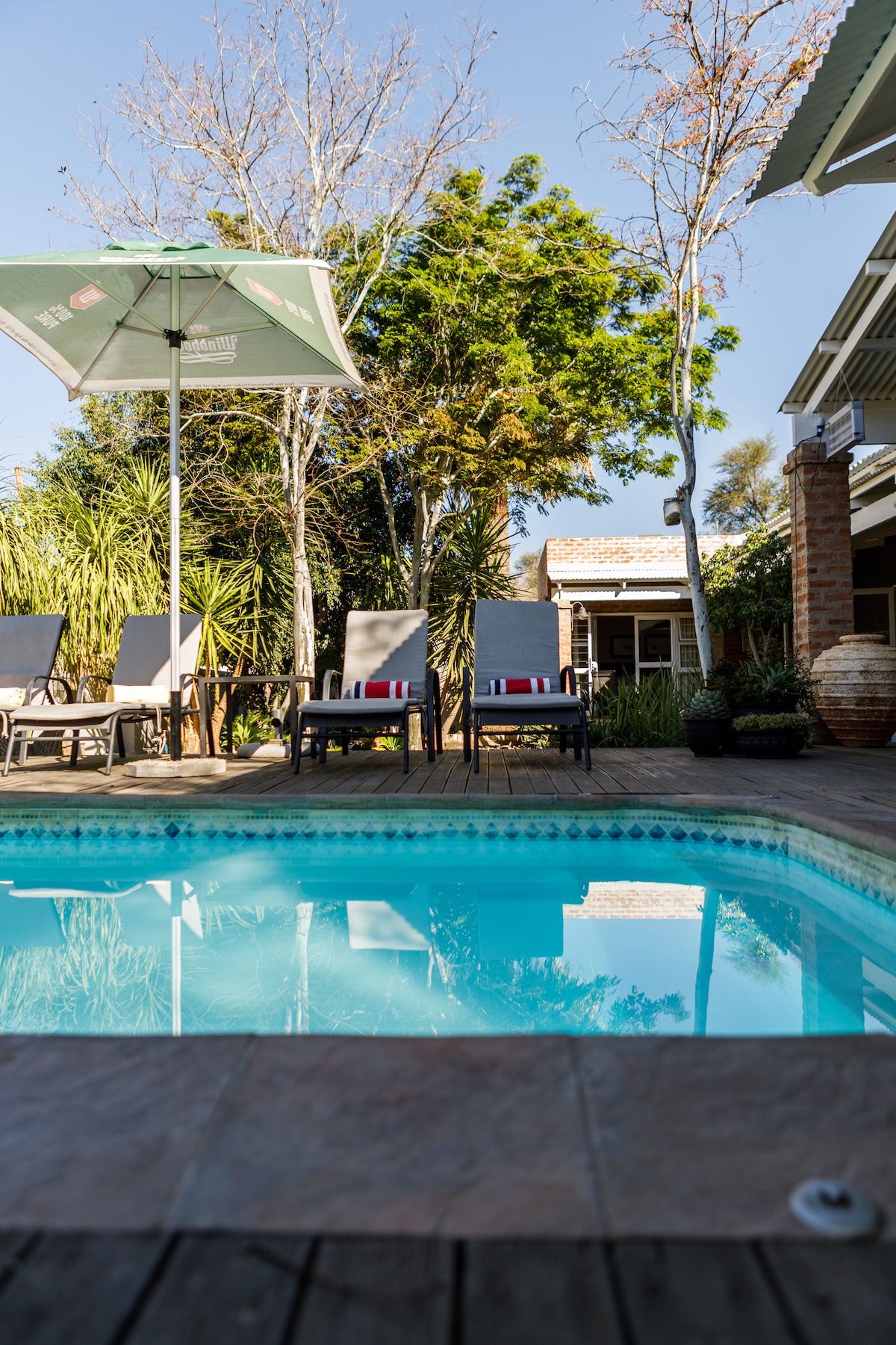 This is a convenient and comfortable self-catering unit with an inviting large bedroom (king size and extra length bed), bathroom with shower, and a full kitchen with dining table. You can relax outside with shaded seating under large trees and dining space next to the pool surrounded by a lush mature garden with plenty of shade and a lawn.
