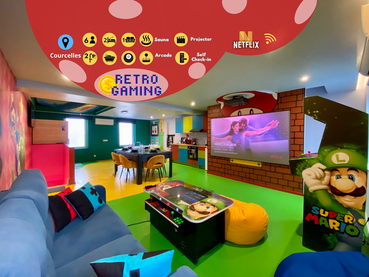 🎮 Welcome to the Retro Gaming Room ! Have an unforgettable stay for one night🍄 UP TO 6 GUESTS • 2 queen bedrooms + sofa bed • Sauna & hot tub for total relaxation • Pool table, Nintendo Switch & over 100 free arcade games • Hanging nets to chill like a true gamer • Cinema projector for epic movie nights 🍿 • Mario-inspired décor – total immersion guaranteed! • Free street parking & self check-in → Fun, comfort & nostalgia guaranteed… Ready to press Start? 🎮✨