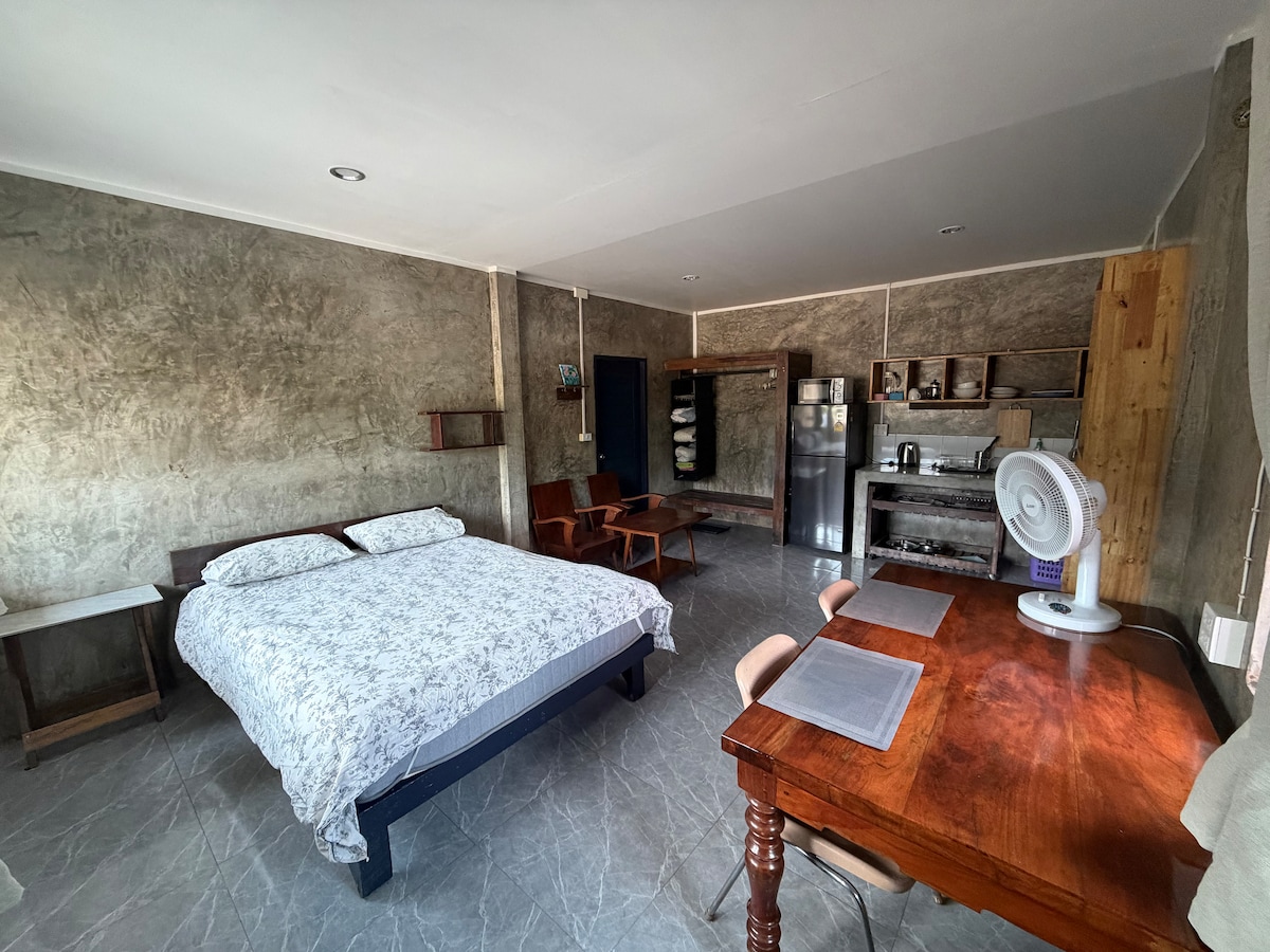 The guesthouse is ideal for those seeking a peaceful and serene atmosphere. The spacious room is well-divided into a bedroom, bathroom, and dining area. A cool breeze flows through, and large windows offer views of the pond and rice fields in the morning. The property is very safe as it is located within the same gated area as the owner’s house. It is only 29 km from the town/airport and close to attractions such as Pua, Bo Kluea, and Market. The hospital is just a 10-minute drive away.