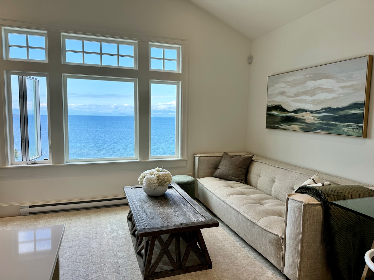 Our suite is a stunning, newly built one-bedroom retreat, featuring a 9’ ceiling and a generous 810 SF space. It features a 58" smart TV, and a fully equipped kitchen, ensuring a high-quality lifestyle during your travels. Revel in the breathtaking sunrise and sunset from your private balcony, with a magnificent view of the ocean and mountains across the Georgia Strait. Conveniently located, our suite is an ideal base to discover Vancouver Island’s allure.
