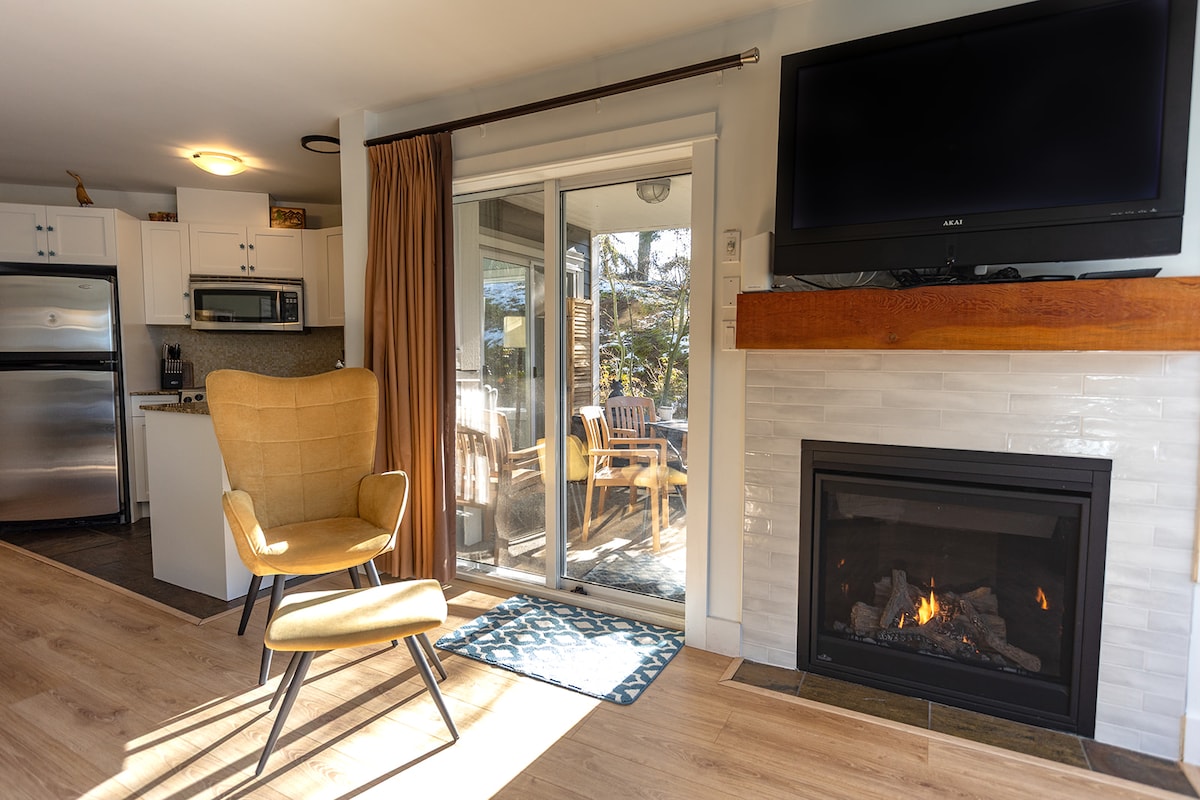 You are on the beach as soon as you step out the ground level patio doors. Two free kayaks throughout your stay May- Sept. Two adult lifejackets. The studio features hi-quality furnishings, full kitchen and tons of amenities in the area! Heated bathroom floor, gas fireplace, new smart TV, many small appliances, as well as in-suite W/D. One queen size bed with an organic mattress and a twin pull out that sleeps one. Decor is inspired by art . Beauty abounds inside and out.