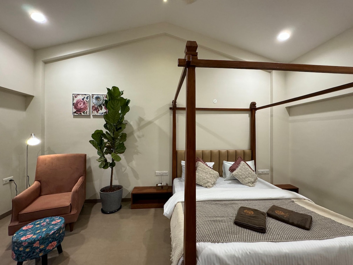 Surrounded by the beautiful verdant hills, accompanied by the fresh Sahyadri ranges stream running its edge offers a blissful sanctuary away from the chaos of urban life. At our quiet place, you are embraced by the rustling of leaves, the melodious bird calls. The unique, warm-toned, earthy finishes complement whitewashed walls to create a calm atmosphere. Make the most of the tropical weather spend your day floating in pool, walking barefoot on the lush, beautifully manicured lawn.