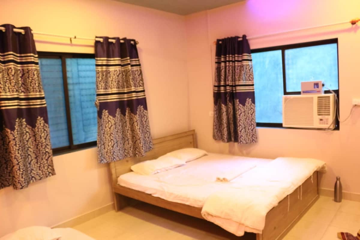 Full bungalow. 2 air-conditioned bedrooms with attached bathroom, kitchen with fridge and microwave. 500meters from kashid beach, 5-10 mins walk. Complete privacy, 50mbps optical fiber WIFI connection, Breakfast included. Parking available. Max 6 members IMPORTANT Kitchen for reheating food only. Fridge use OK Low network coverage area Weekly electricity cut, Tuesdays 10am-6pm, No AC in these times. Main road 300m, shops 1km away, bring all essentials or inform caretaker in advance.