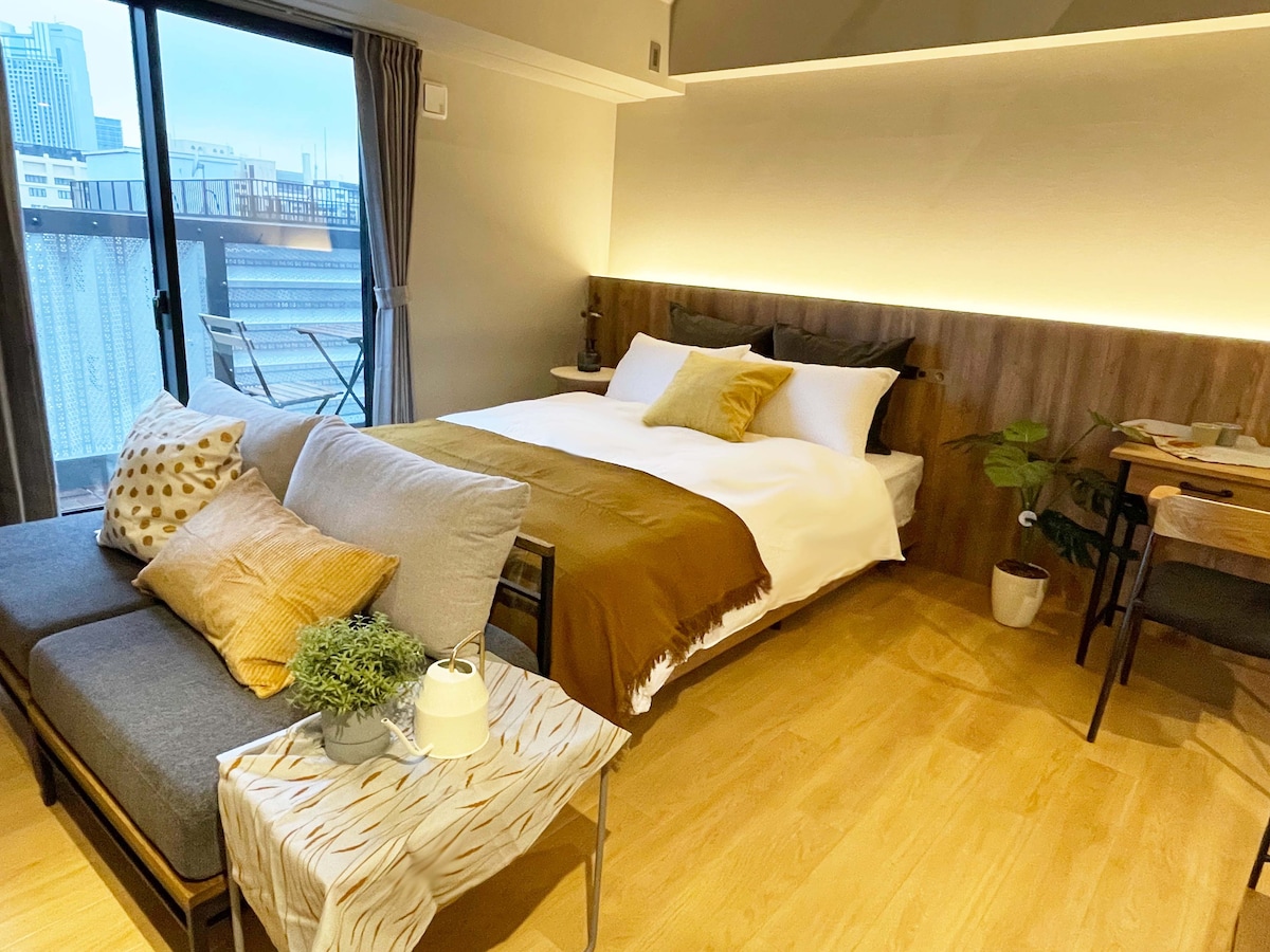 【靠近车站】从心斋桥站步行1分钟即可到达!步行5分钟即可抵达道顿堀!21平方米的时尚大床房!可当天预订