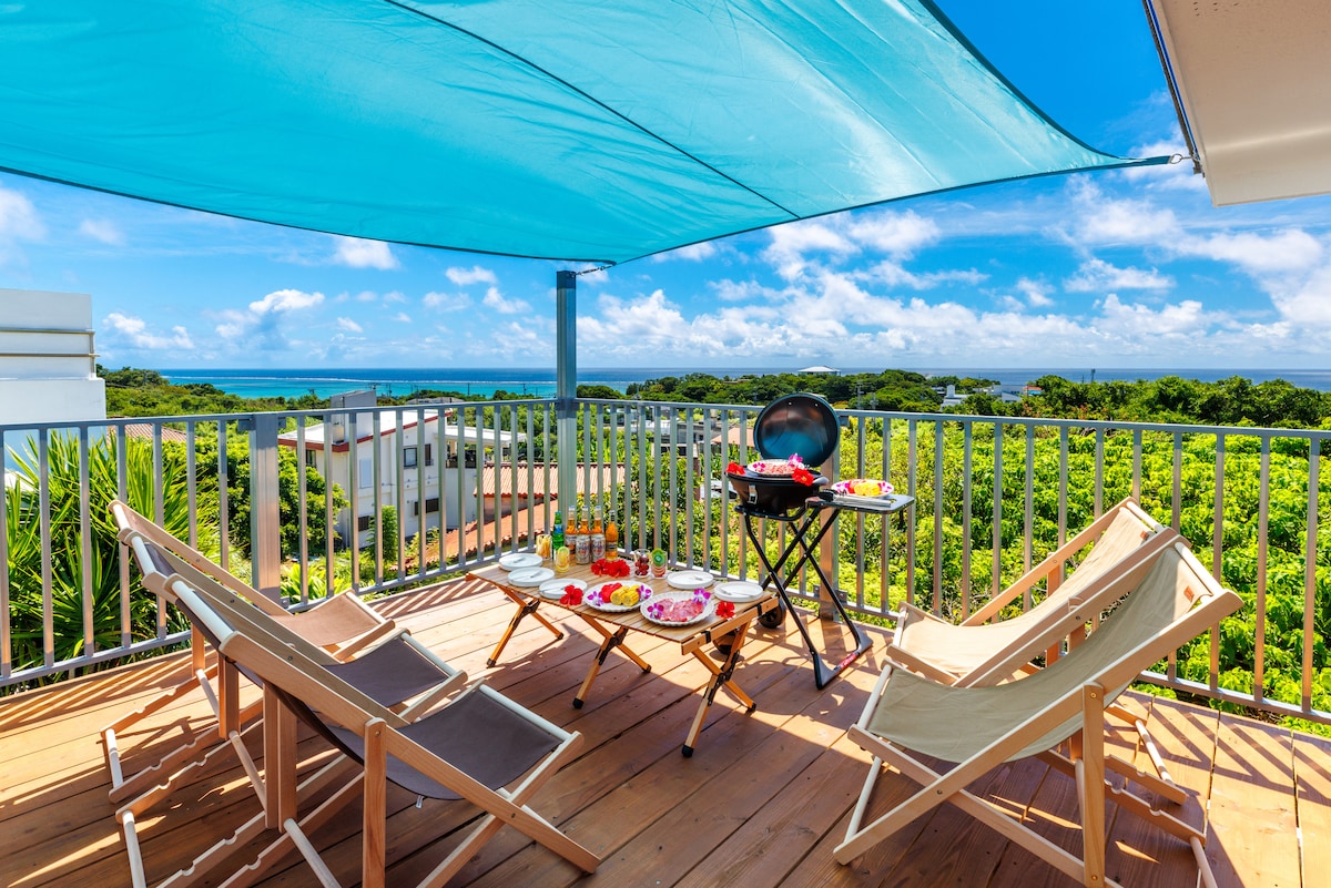 340度オーシャンビューの崖の上に立つ2022年9月新築の一軒家。 約100平米のすべての部屋がオーシャンビュー。お客様の使用可能エリアは2階の宿泊施設と、3階屋上のバーベキューテラスです。 各部屋に50インチ以上のテレビ、リビングには4Kプロジェクターと大型のスクリーンがあり、映画鑑賞も可能です。 外階段からつながる屋上にはバーベキューテラスがあり、サンライズも、日中のオーシャンビューも、夕方のサンライズも、夜の夜景と星空、月も楽しめます。海や自然の景色に癒されます。 屋上テラスにはトイレが完備されており、キッチンスペース、洗い場もございます。コンセントは8つ有り、IHを使った調理なども可能です。 2つある寝室には、ダブルベッドが2つずつ用意されており、最大8名様の宿泊が可能。 リビングにあるソファーにもシングルベッドサイズのスペース有り。 カップルでも、ご夫婦でも、ご家族でも、3世代のご旅行でもお勧めです。 周りはとても静かで、夜は虫の音色、フクロウの声、耳を澄ませば波の音なども聞こえてきます。 車で10分の場所に海中道路などがあり、マリンスポーツの拠点としてもお勧めです。