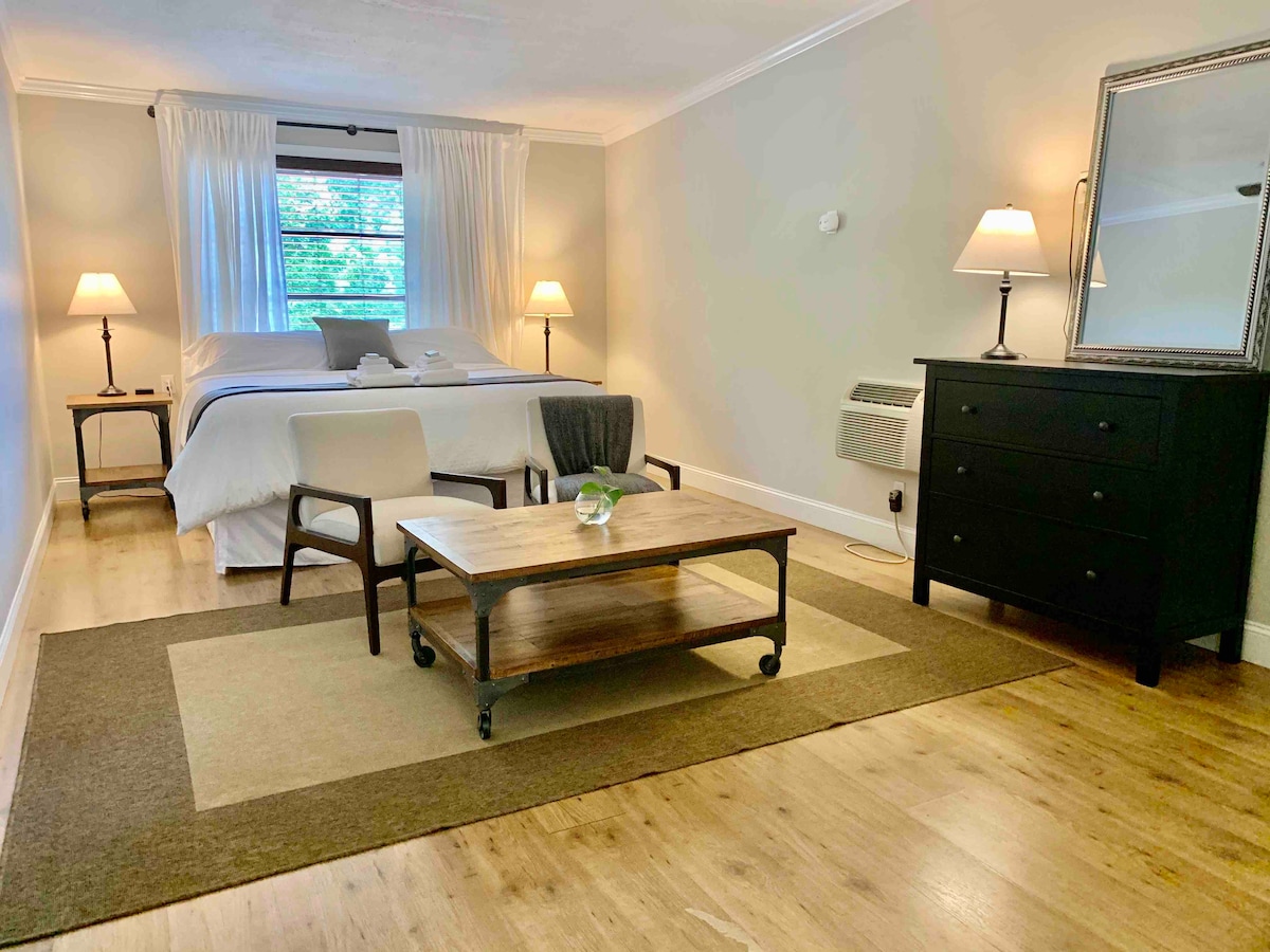 Located on 34 acres in the heart of Sumter National Forest, just 5 minutes from the Wild and Scenic Chattooga River, our rustic post and beam lodge, music loving tavern, 8 guest rooms and 17 creekside campsites will create memories that last a lifetime. Room 6 has one queen and is on the more social Courtyard Side. No private baths but the large marble bath house is steps away. All rooms have a rustic/lodge/mountain feel with vaulted ceilings, mini fridge, pod coffee maker and 40" tv.