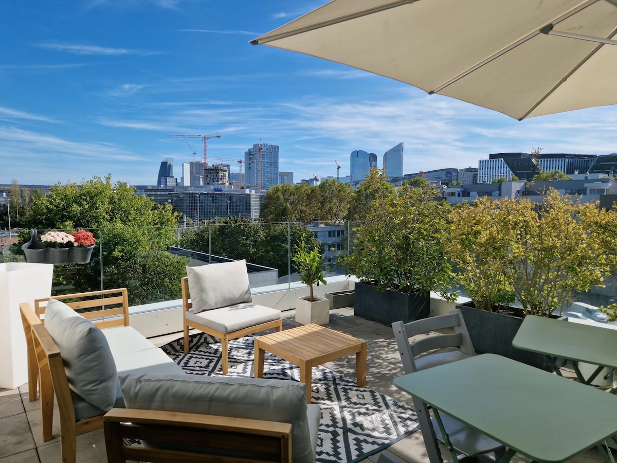 Ce logement unique entièrement rénové (une chambre avec lit double et un canapé convertible 140 dans le séjour) dispose d’une grande terrasse de 40 m2 sans vis à vis équipée d’une table, de bains de soleil. Il est proche de Paris (la Défense en 12 mn, Champs Elysées en bus et RER en 20 mn, La Défense Arena en 10 mn en bus et 30 mn à pied) et dispose de commodités (au pied de l’immeuble supermarché, boulangerie et pharmacie)