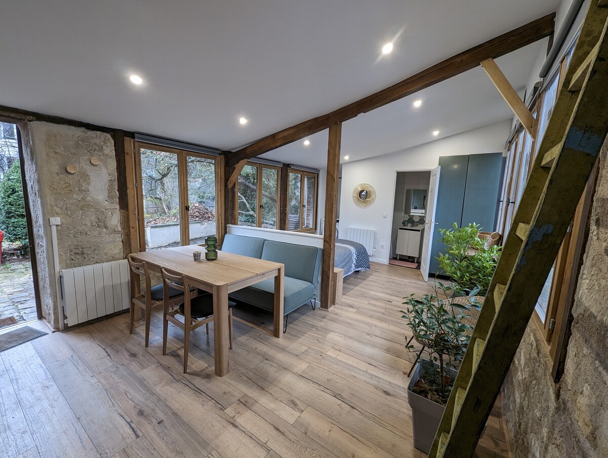 Détendez vous dans ce logement unique, calme et paisible en plein centre ville de Nanterre! Cette maisonnette au charme de l'ancien et très lumineuse vous accueillera au calme dans un jardin privé! Le logement bénéficie d'une terrasse et d'un jardinet dédiés au logement. La maisonnette est organisée comme un grand studio, avec un espace chambre avec un grand lit et un espace lieu de vie avec une banquette convertible en lit.