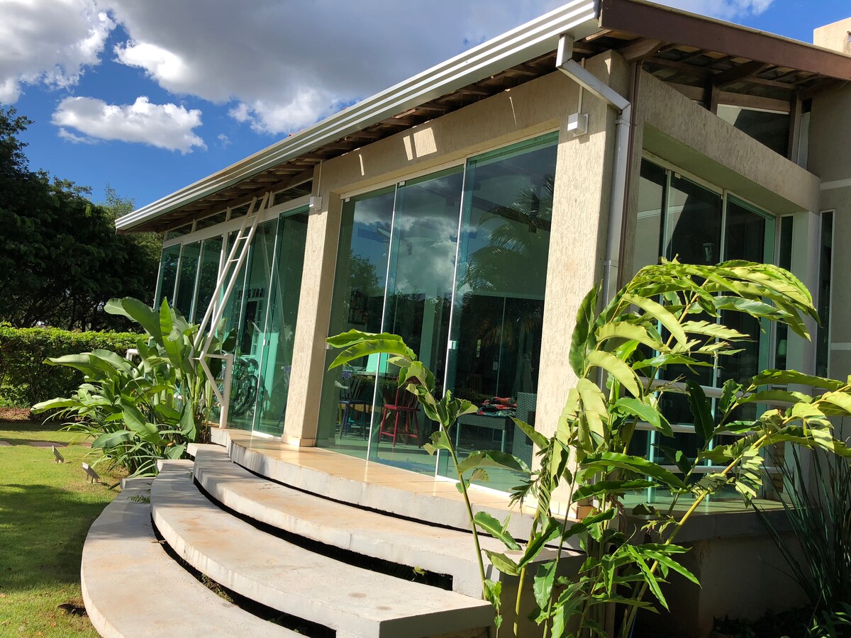 A casa fica em um condomínio fechado numa ilha, a Ilha do Sol. O acesso é feito por Primeiro de Maio, onde fica a entrada do condomínio, que possui estacionamento seguro. A travessia para a ilha é feita por embarcação e cobrada à parte (taxa condominial). Na ilha, o transporte dos hóspedes até a casa é feito por um trenzinho do condomínio, assim como o retorno para o continente. A experiência na casa é única, pela tranquilidade e contato com a natureza, além da possibilidade de fazer festas.