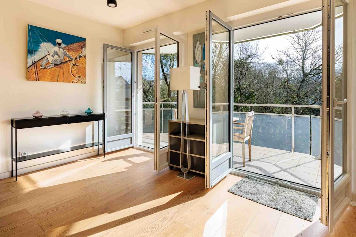Vue exceptionnel de ce deux pièces situé au dernier étage d'un immeuble bordant la rivière de l'Erdre. La décoration soignée, la terrasse, le quartier arboré, les commerces de proximité, les ballades le long de la rivière et le Centre Ville à 10 mn en tram ou en vélo font de cet appartement un lieu de vie très agréable. Il est entièrement équipé haut de gamme, avec une place de parking en sous-sol, cet appartement vous accueillera pour la durée de votre choix.