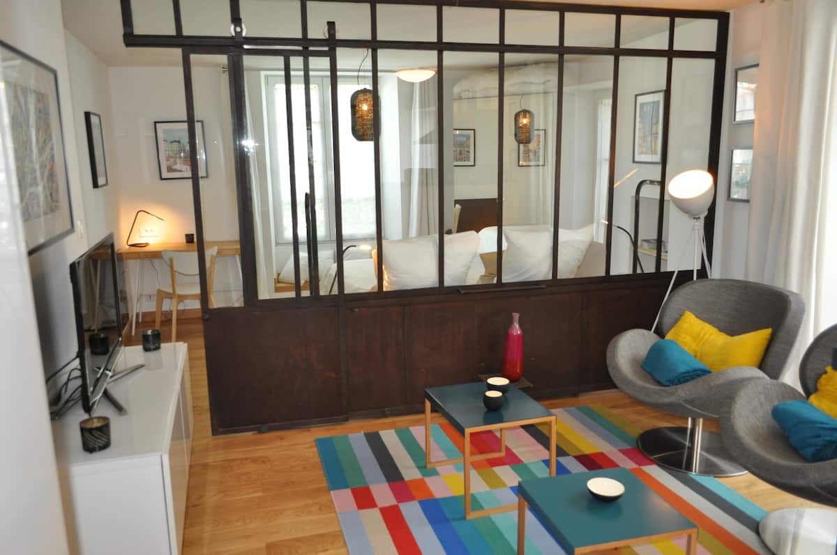 Bienvenue dans notre duplex, situé au cœur du centre-ville de Nantes au rez-de-chaussée d'un bel immeuble ancien en face du lycée Jules Vernes. Dans une rue piétonne, au calme (hormis aux heures d'intercours), à deux pas de la place Aristide Briand, il est un parfait pied à terre pour découvrir la ville. Vous pourrez profiter à proximité d'un large choix de lieux culturels, de boutiques, d'excellents restaurants et de commerces de bouche selon vos envies et votre budget.