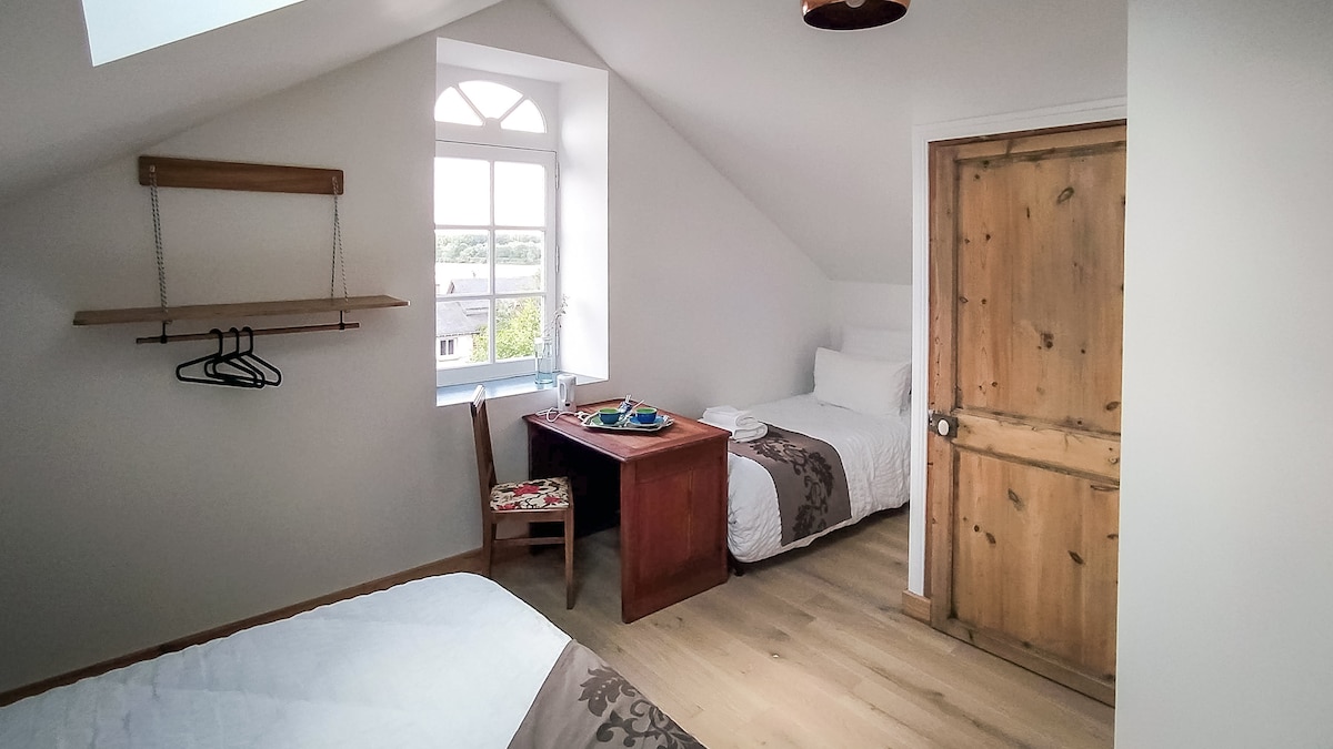 Chambre double chez l’habitant avec salle de douche privative (douche, vasque et toilettes). Une mezzanine offre un espace télé confortable (compatible chromecast) et un clic clac convertible en couchage supplémentaire (sur demande). L'escalier menant à cet étage est une échelle à pas décalés. La fenêtre de la chambre donne sur le jardin de la maison. L'environnement est calme tout en étant à proximité directe des commodités du centre bourg. Chambre non fumeur