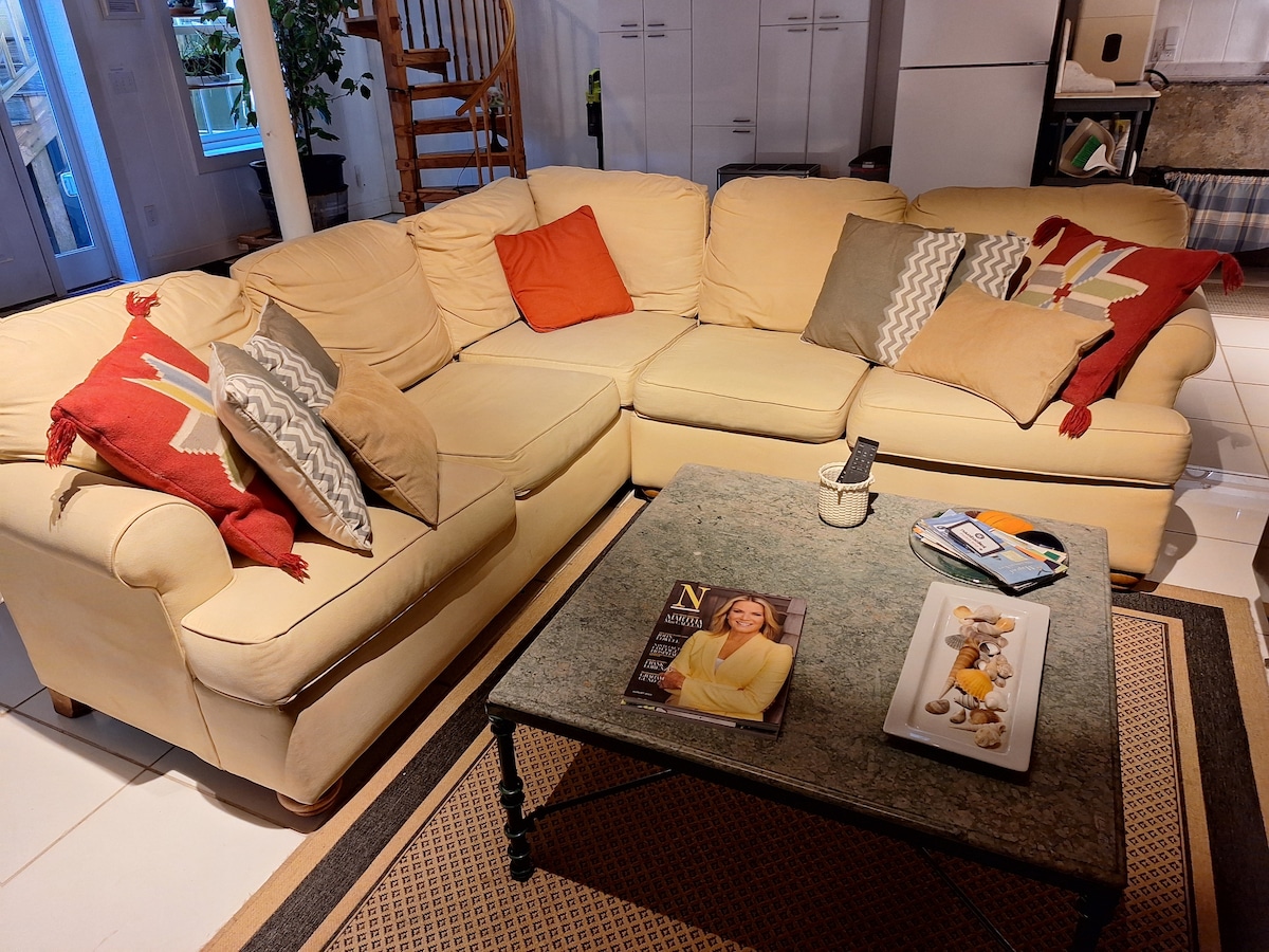 Located in a quiet neighborhood off of Cliff Road, guests can relax in a spacious 350 sq/ft beautiful bedroom with a comfortable king size bed and single day bed (w/trundle). There is a 3 piece private bathroom with washer/dryer. A full size pull out sofa is available in the very large kitchenette/game room. A 300 sq/ft comfortable sitting room with sofa, cable television, wine fridge and high top table is for your exclusive use. A private entrance allows guests to come and go freely.