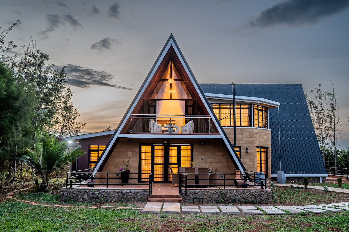 Tucked into a beautiful landscape with great views, Kilima A-frame is the perfect weekend hideaway. With a full glass wall facing mount Kenya and the stars, an outdoor kitchen and en-suite bathroom, you get full comfort with a glamping vibe. The A-frame is located on a big, guarded, private plot called “Kilima Gardens” 15 min from Nanyuki. Feel free to walk around, pet the donkeys and pigs, watch the sunset from the treehouse or enjoy the fire-heated sauna with a plunge pool. Welcome! Karibu!