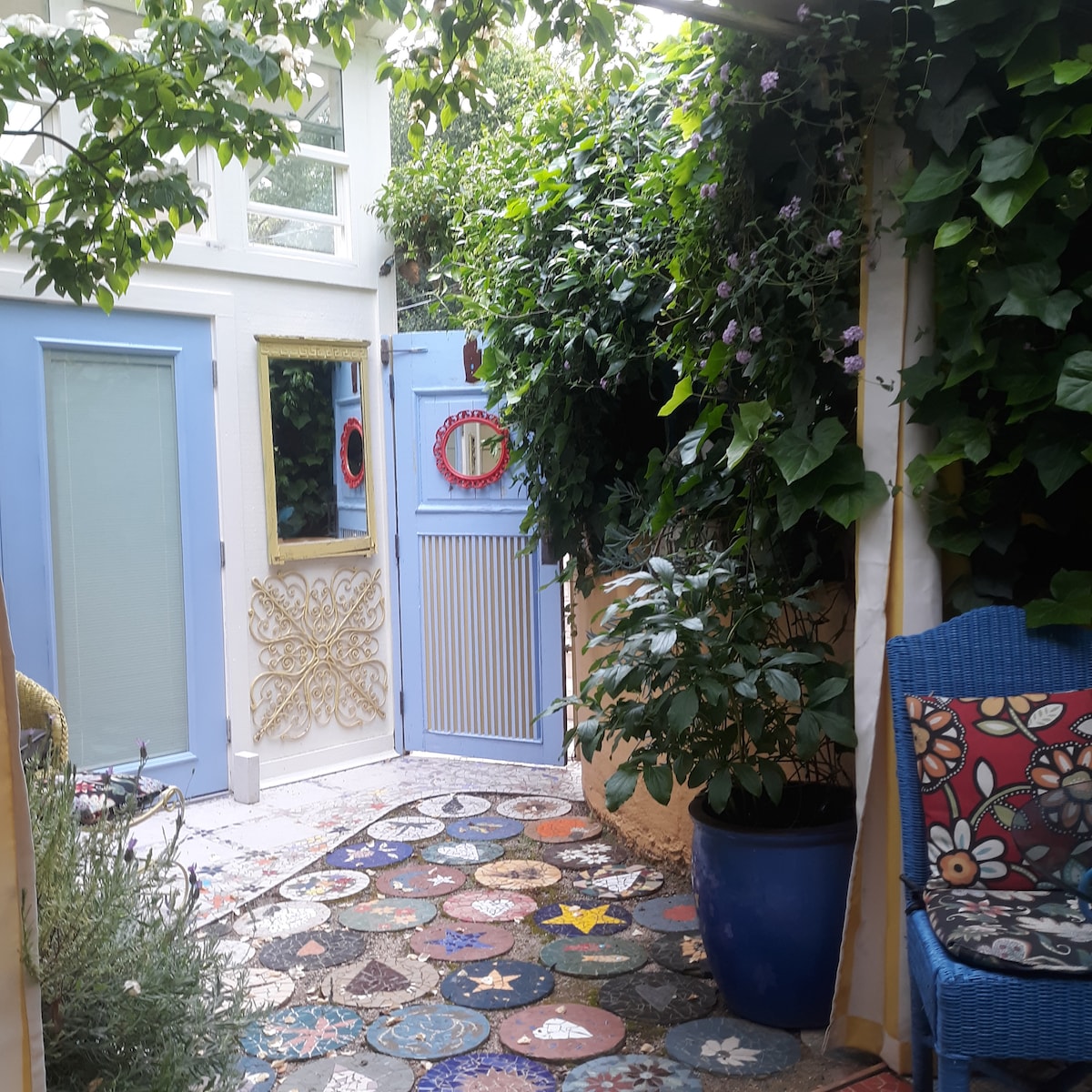 After parking on the property, access through a private garden gate. Pass over the patio to enter the studio apartment. Stepping down to enter the homey space you’ll enjoy acomfortable queen sized bed, walk in closet, private bathroom, and kitchen. Empty drawers greet you in the dressers . San Francisco is 30 miles by car, an hour by ferry or bus; Napa, 15 miles away. A great way to see the sites; allowing you prepare some light meals between savoring the local cuisines. Host on premises