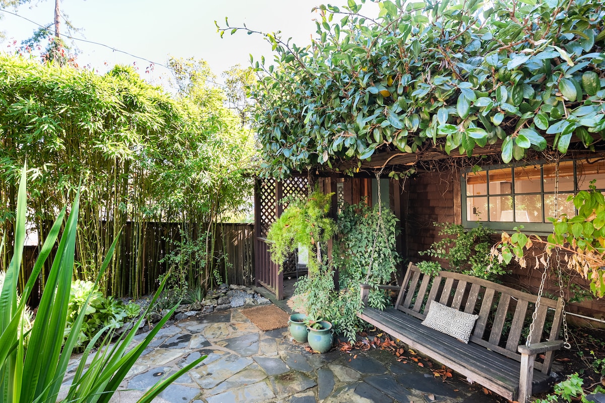 Linger over a coffee in the zen, vine-covered courtyard at this secluded cottage nestled in the back of a period property in Berkeley. Crisp white sheets, craftsman furniture, and painted wooden cladding make for a sophisticated yet rustic haven. The main room is cozy with a big skylight, comfortable queen bed, swivel chair, and desk and chair. There is a small kitchenette. Outside is a stone patio, a swinging bench that overlooks a koi pond, and a small outdoor table and chairs. ZCSTR2021-0842