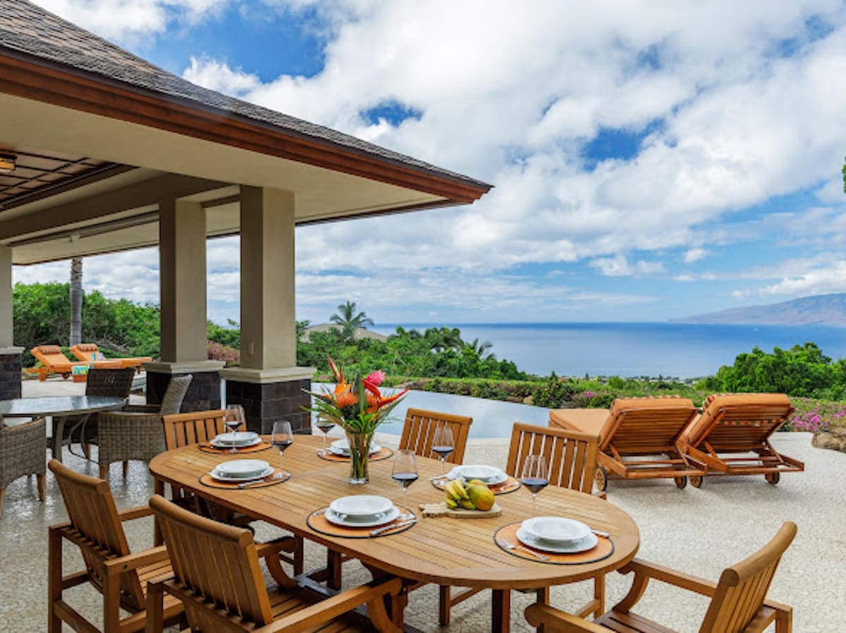 The grace and beauty of the outdoors at Blue Sky Villa are only matched by its pristine and vast interiors. This luxury house was built to enjoy the natural beauty and breezes of Maui, enabling the ultimate indoor/outdoor living experience. Doors fully retract in the master bedroom as well as the living and dining rooms. The living room features a white baby grand piano that awaits the life breath of music.