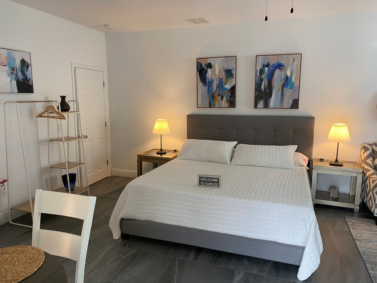 Gorgeous newly renovated private one King bedroom with en-suite bathroom. This 1st floor studio has modern updates with new furniture, comfortable mattress, fluffy pillows & luxury linens. Small refrigerator, microwave & Keurig in studio for guests to use. Just BLOCKS to the best beach where the sunsets are divine at Vanderbilt Beach. Easy walk to the Ritz Carlton Naples Beach Resort with the finest ocean front dining. Enjoy beach activities including shelling, SUP, fishing, kayaking & more!