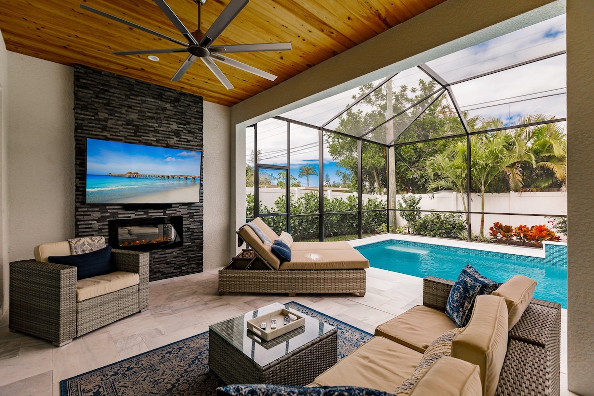 Welcome to the brand new, absolutely stunning, Villa Southbreeze! This 3 bedroom, 2 bathroom vacation rental is fully furnished &equipped. Stunning high ceilings, huge 72" fireplace, office, laundry room all Samsung stainless-steel appliances, and much more. Out by the huge screened-in pool area you'll find a private electric heated pool, BBQ propane grill, several loungers, large table + chairs. The heated pool features two fountains and a shallow "beach area". Welcome to the villa Southbreeze!