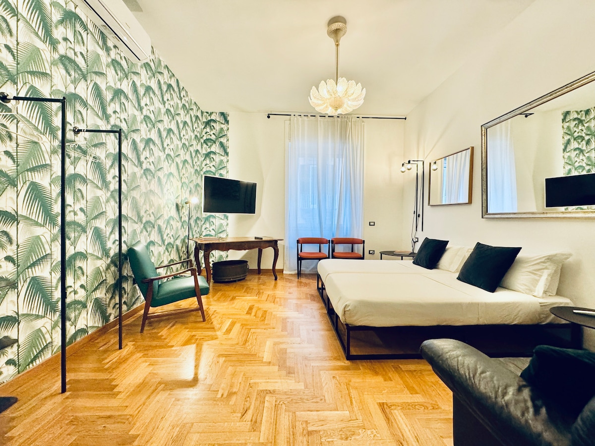 Preparati ad immergerti nella vita di oltre 100 anni fa. Tuffati in un ambiente ricco di arte ed ammira i meravigliosi affreschi Liberty che decorano il soffitto del salone e della camera da letto. Un'ampia balconata circonda tutto l'appartamento per gustare un aperitivo seduti al tavolino. Nell'ampio salone una grande libreria separa la zona pranzo dalla seconda zona letto. Oltre i soffitti affrescati troverete i pavimenti originali ed arredi d'epoca, per un'esperienza di suprema bellezza.