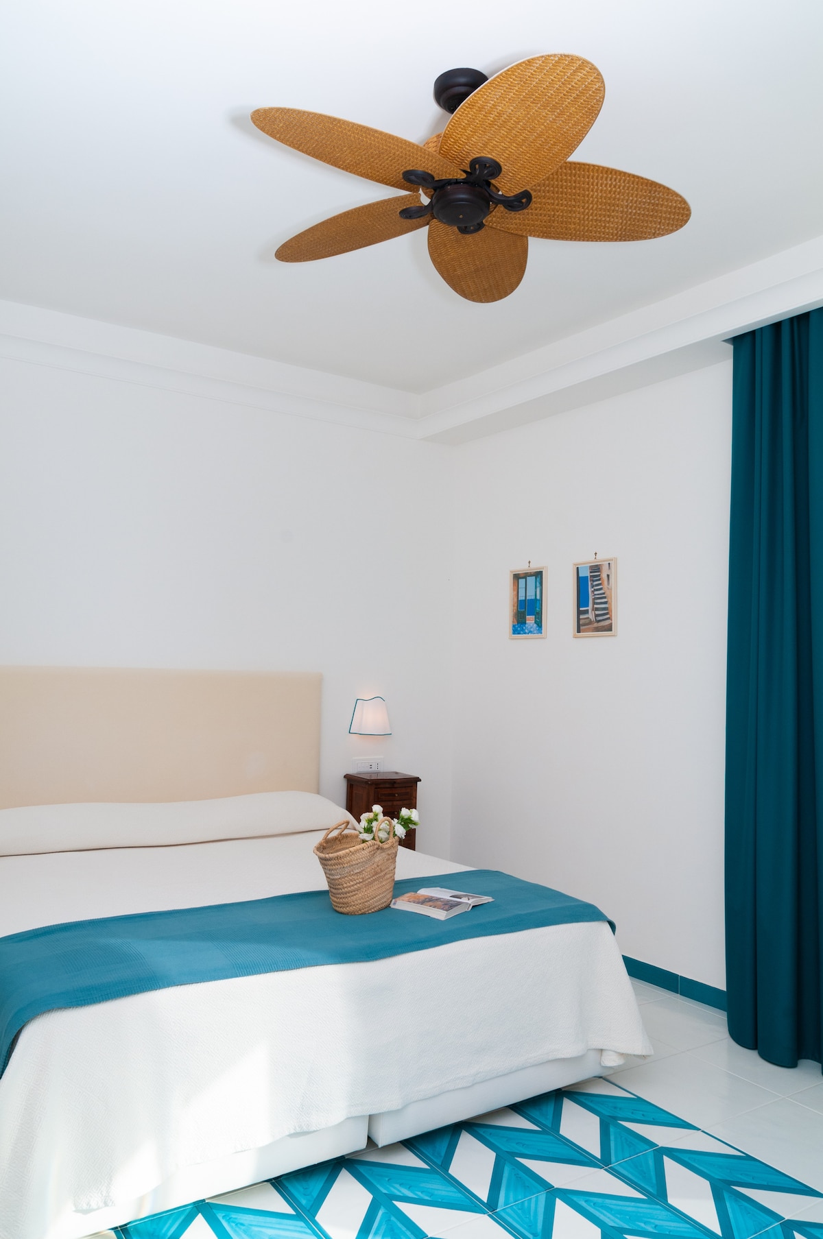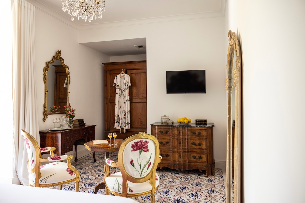 The Ludovico Family Suite, with two connecting bedrooms and two bathrooms, is a refined retreat of elegance and inspiration. Vietri floors, soft hues, and natural details like prickly pears and cherry blossoms create a sophisticated atmosphere. Spacious terraces flood the suite with light and offer breathtaking views of Mount Vesuvius and the ancient pine.