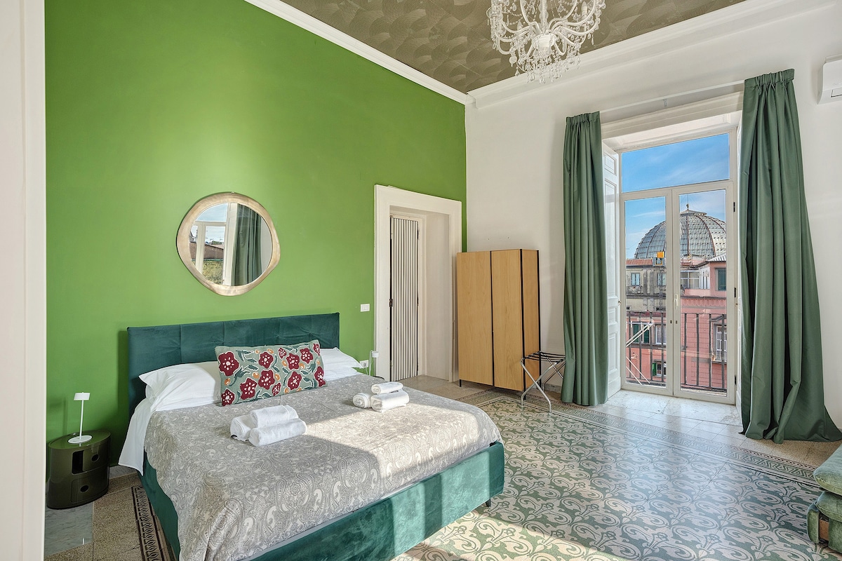 Antica Dimora Deluxe guest house in Naples offers 65 sqm and accommodates up to 6 guests. There are 2 bedrooms: one double and one quadruple with a double bed and double sofa bed, plus 1 bathroom with shower, bidet, and essentials. Enjoy 3 private balconies, one overlooking Galleria Umberto I, air conditioning, high-speed Wi-Fi ideal for video calls, TV, workspace, mini fridge, wardrobe, elevator, and breakfast room.