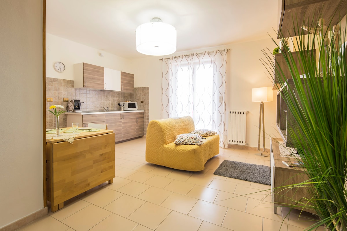 Gold superior apartament, così denominato perchè l'appartamento piu' grande della struttura Flyresidence. Camera salotto con letto matrimoniale, e divano letto e matrimoniale , con comodo tavolo scrivania, ideale per consumare una colazione una cena, o per lavorare al pc. Cucina comoda e ampio bagno, il tutto nuovissimo e di design moderno. Progettato in modo da offrire il massimo confort, che solo un aparthotel puo' offrire. La grande finestra extra large offre grande luminosità.