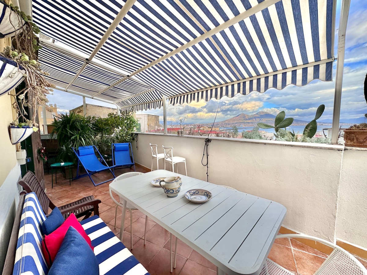 Recentemente ristrutturato in stile contemporaneo l'appartamento gode di una vista spettacolare sul Golfo di Napoli, dal Vesuvio a Capri. Posizionato all'ultimo piano di una villa storica con ascensore. L’attico si compone di un grande spazio living con cucina a vista, due camere matrimoniali, due bagni ed un terrazzo privato. Inoltre, gli ospiti potranno usufruire gratuitamente di un posto auto privato all'interno del cortile ma non custodito.