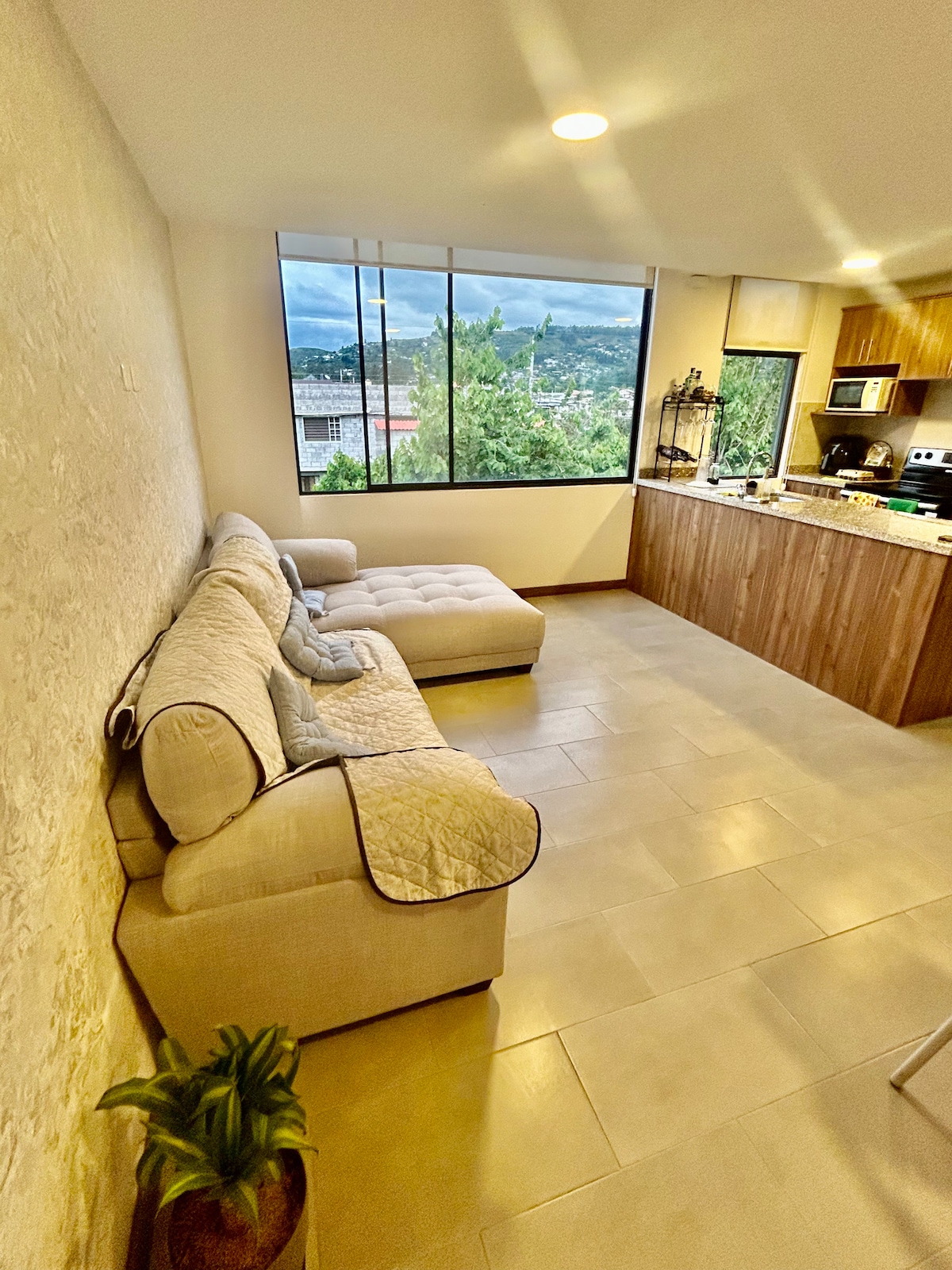Hermoso depar moderno full equipado por estrenar en el ultimo piso con vista panorámica. Dentro de la urbanización de lujo Aurora con las mejores areas sociales: piscina, futbol, tenis, basket, volley, ciclovía, squash, cine, piscina, jacuzzi, sauna, turco, gym, bbq, cuarto de juegos, cuarto de niños, sala comunal Junto a la ruta viva a 5 min de Cumbaya, a pocos minutos de los principales centros comerciales de los valles, colegios, restaurantes, rodeado de espacios verdes.