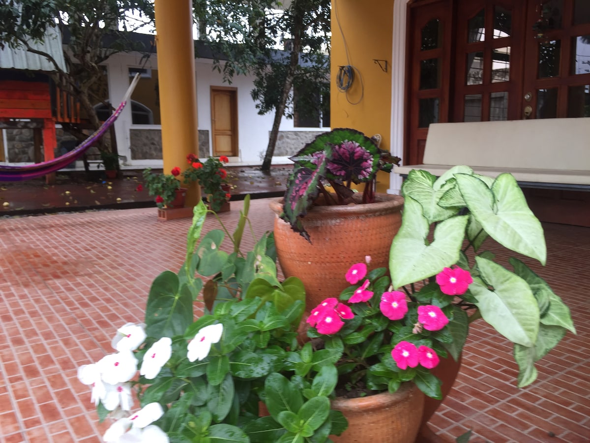 Es un espacio de aproximadamente 20 metros cuadrados, cuenta con una cama de dos plazas, agua caliente en el baño. Es un sitio seguro, fresco, acogedor, lleno de vegetación y visita de pájaros en las mañanas; ubicado en una zona alejada del ruido de la ciudad, y a una distancia de 3 kilómetros del centro de la ciudad. Mi interactuar será llena de hospitalidad y guía de los mejores lugares para visitar. Brindaré desayuno a los huéspedes.
