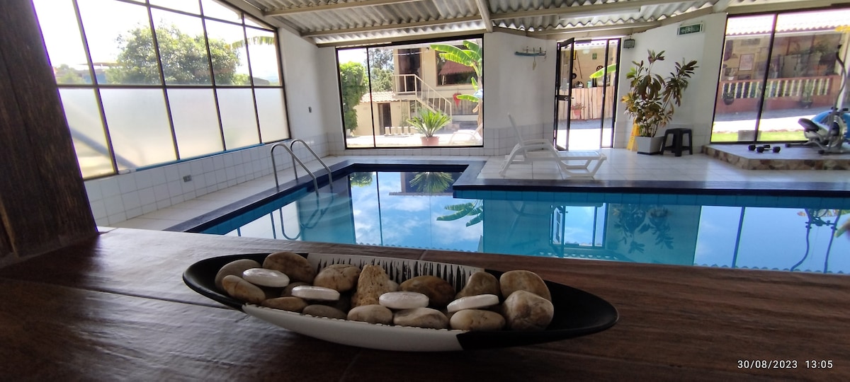 Desconecta de la rutina en este alojamiento único y relajante. Despierta rodeado de naturaleza y el trinar de los pájaros. Disfruta del majestuoso Acantilado desde una cómoda habitación dúplex con salida directa al jardín, piscina infinita y mirador. Relájate y toma el sol en los cojines flotantes sobre la piscina, duerme plácidamente en las hamacas en medio de un oasis de árboles o admira el atardecer con una taza de café y la espectacular vista del Acantilado y la cordillera oriental.