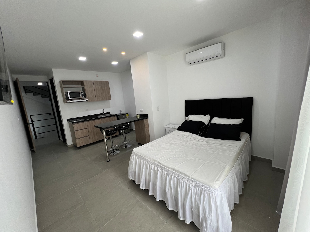 Disfruta de una estadía única en nuestros modernos y acogedores loft tipo estudio, ubicado en el sur de Cali, con una ubicación privilegiada. * Aire Acondicionado. * Una cómoda cama doble. * Cocina completa equipada con una práctica barra de comedor. * Baño completo con regadera * Disfruta de las vistas panorámicas de la ciudad desde la terraza del edificio. * En el barrio encontrarás una amplia oferta de restaurantes, bares farmacias y tiendas, todo a pocas cuadras de distancia..