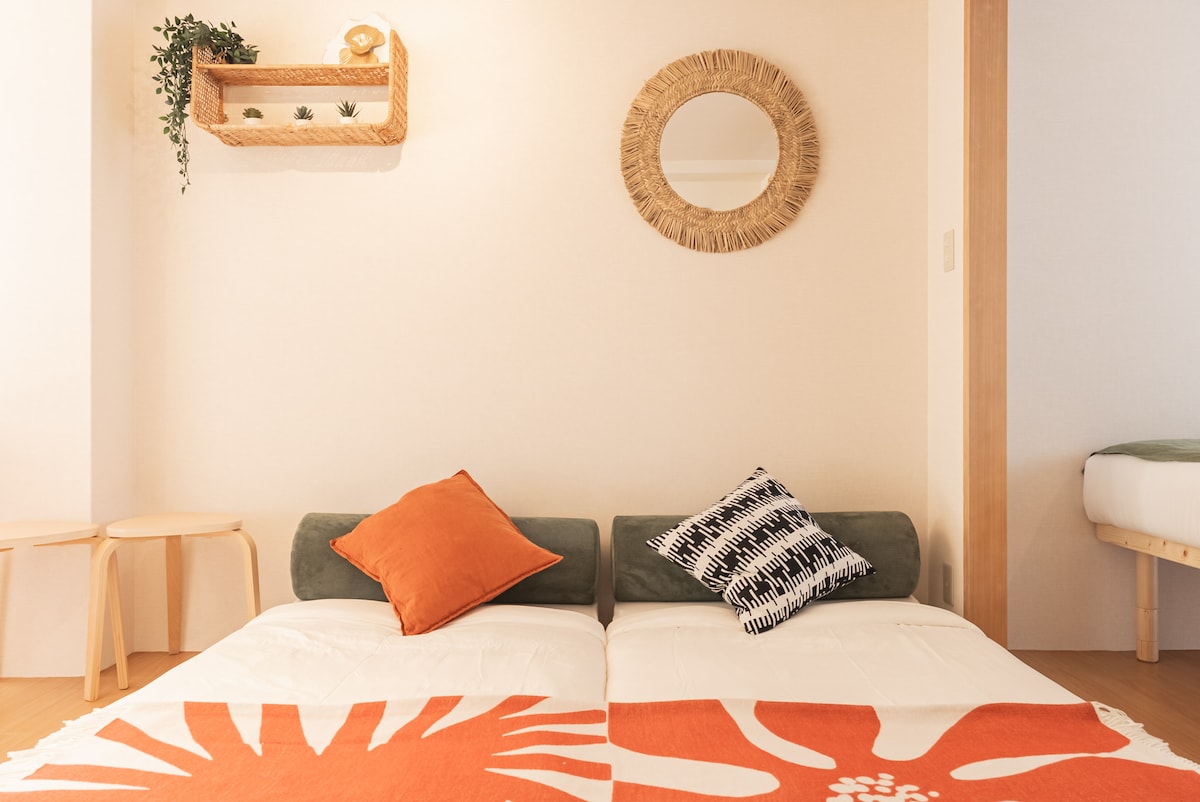 这是一间由室内设计师从零打造的 1LDK、41㎡ 公寓型民宿。 同一栋大楼内设有多间独立客房。 步行 7 分钟即可到达南海电铁与大阪地铁的天下茶屋站,从那里乘坐南海电车 2 站(约 5 分钟)即可到达难波站,无需换乘即可 35 分钟直达关西机场。 大阪地铁堺筋线还可直达京都、通天阁、黑门市场等主要观光景点。 天下茶屋是一座保留昭和时代风貌、又不断涌现新餐厅与商店的热门街区,兼具怀旧与活力。 ◆ 房源特色 安静、安全的住宅区 直达难波、关西机场、通天阁、黑门市场、京都(阪急线),无需换乘 步行 2 分钟范围内有便利店与超市 车站前设有购物中心 厨具齐全,可自行烹饪 整间独享,完全私密 自助入住系统,轻松无压力 免费洗衣机(附赠洗衣液) 洗漱用品齐全(洗发水、护发素、沐浴露、浴巾、拖鞋、牙刷、化妆棉、棉签、剃须刀) 可用日语、英语跟中文沟通 提供高速 Wi-Fi