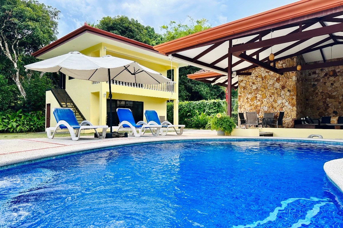 On 22.5 acres of jungle located 10-15 mins east of Dominical at 1100 ft above sea level, Casita Limon has 2 BRs (1 queen bed, 1 full bed), with AC in main BR, 1 bath, louvered/screened windows & ceiling fans in all rooms, outdoor ceiling fans, covered parking, & electronic gate. Starlink with backup fiber optic WiFi, Smart TV, Firestick and Chromecast. Wrap-around patio has washer/dryer, private pool, and outdoor furniture for wildlife watching and listening to bird symphonies and Howler calls.