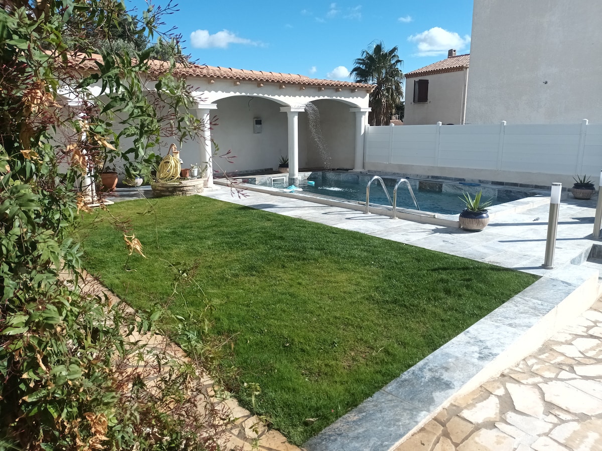 Gîte de charme confortable de 67m2 classé 3 étoiles , un terrain clos planté de pins, avec belle vue, pétanque, cuisine bien équipée, une chambre lit baldaquin, plus une autre chambre avec un lit en 140 et un 90 grande salle d'eau moderne terrasse ensoleillée sans vis à vis, piscine couverte. Situé à la campagne à 600m d' un super U, Mc Do et boulanger et à 5km de Narbonne, plages à une vingtaine de km, nombreux chemins de rando dans les Corbières, châteaux Cathares, réserve africaine de Sigean